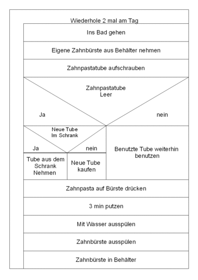 Beim Zähneputzen kann das Problem auftreten, dass die Zahnpastatube leer ist und man diese wechseln muss. Bei voller Tube nimmt man sie weiterhin, jedoch beim Leeren der Pasta muss man entweder eine neue aus dem Schrank nehmen oder, falls keine da ist, in den Laden gehen und eine kaufen.