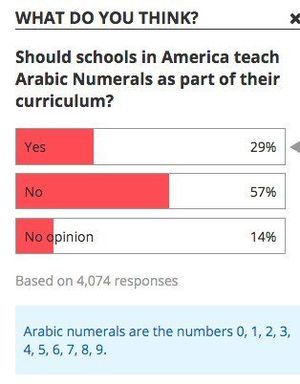 [[Datei:Arabic numerals-poll.jpg|thumb|Umfrage, ob man Arabische Zahlen in Schulen lehren sollte.|link=https://twitter.com/suhaibkhan/status/1127697610741911553]] | |||