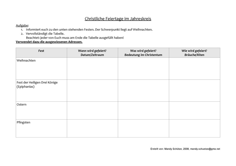 Tabelle christliche Feiertage (ausgefüllt und leer für Schüler)