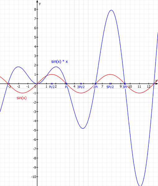 Deutsch: Man sieht die Funktion sin(x)*x und sin(x)