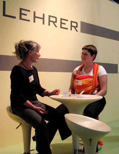 - Beschreibung: Gespräch in der Lehrerlounge: Margit Fischbach und Mandy Schütze mit Baby Franz