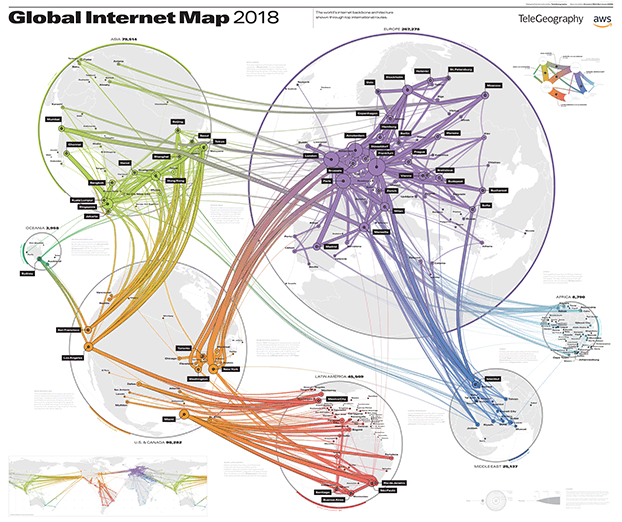 Bldschirmaufnahme der Grafik der interkontinentalen Internet-Verbindungen (Quelle: https://global-internet-map-2018.telegeography.com) |